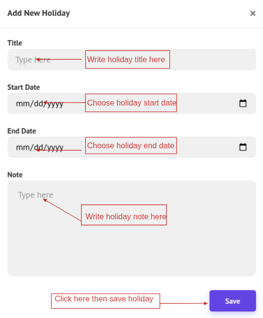 To create a new holiday, click Add New Holiday. A popup window will open—complete the required fields and click Save to create the holiday.