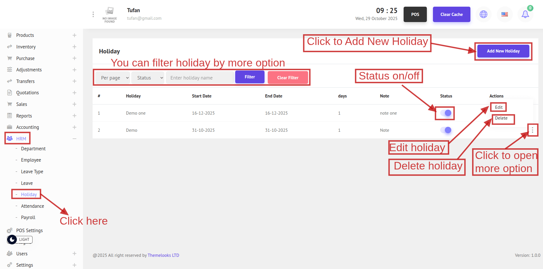To view the holiday list, go to HRM -> Holiday in the menu bar. You’ll be redirected to the Holiday page, which displays all holidays.