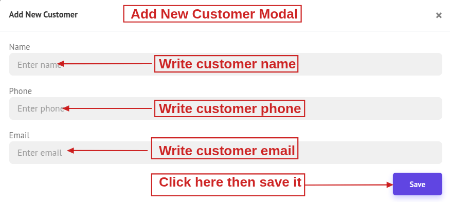 - You can now create a customer by providing the necessary details. Enter the Name, Phone, and email.
