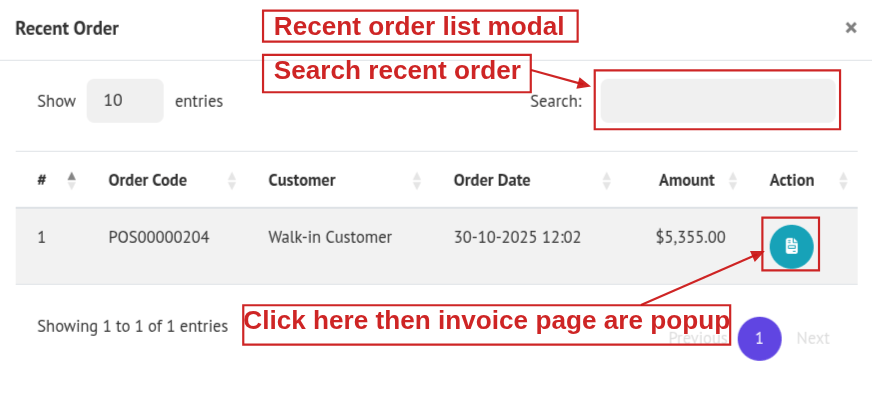9. Customer Order: After selecting a customer, click the view icon beside their name to open a pop-up showing all orders made by that customer.