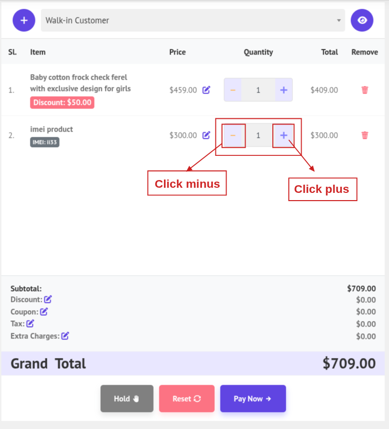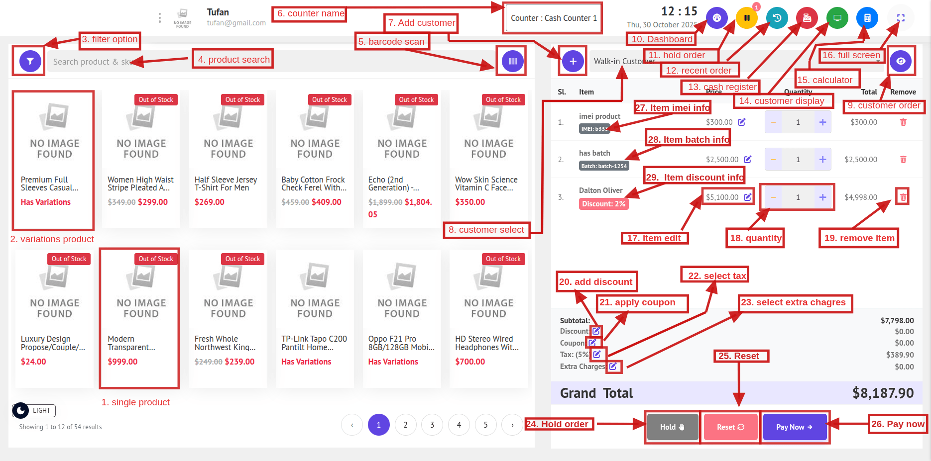 24. Hold Order: Click Hold to save all current cart items as a held order that you can retrieve and resume later.