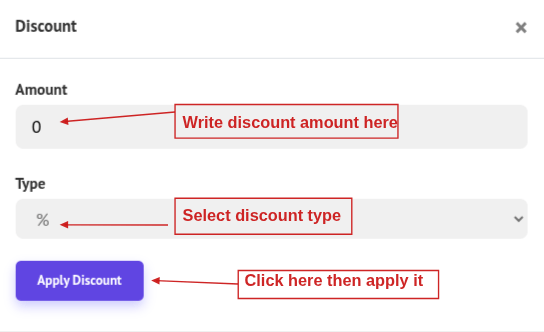 - Enter the discount amount, select the discount type (percentage or fixed), and click Apply Discount. The new discount will be applied.