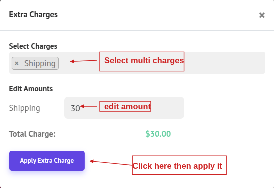- Select one or more extra charges using the multi-select dropdown. Once selected, you can edit the amounts if needed. Then, click Apply Extra Charge to update and apply the information