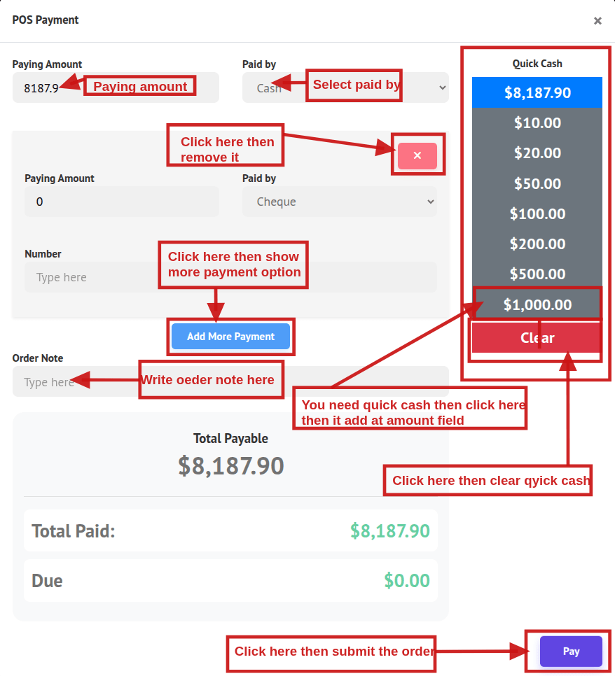 26. Pay Now: Click Pay Now to open the payment popup and complete the transaction.
