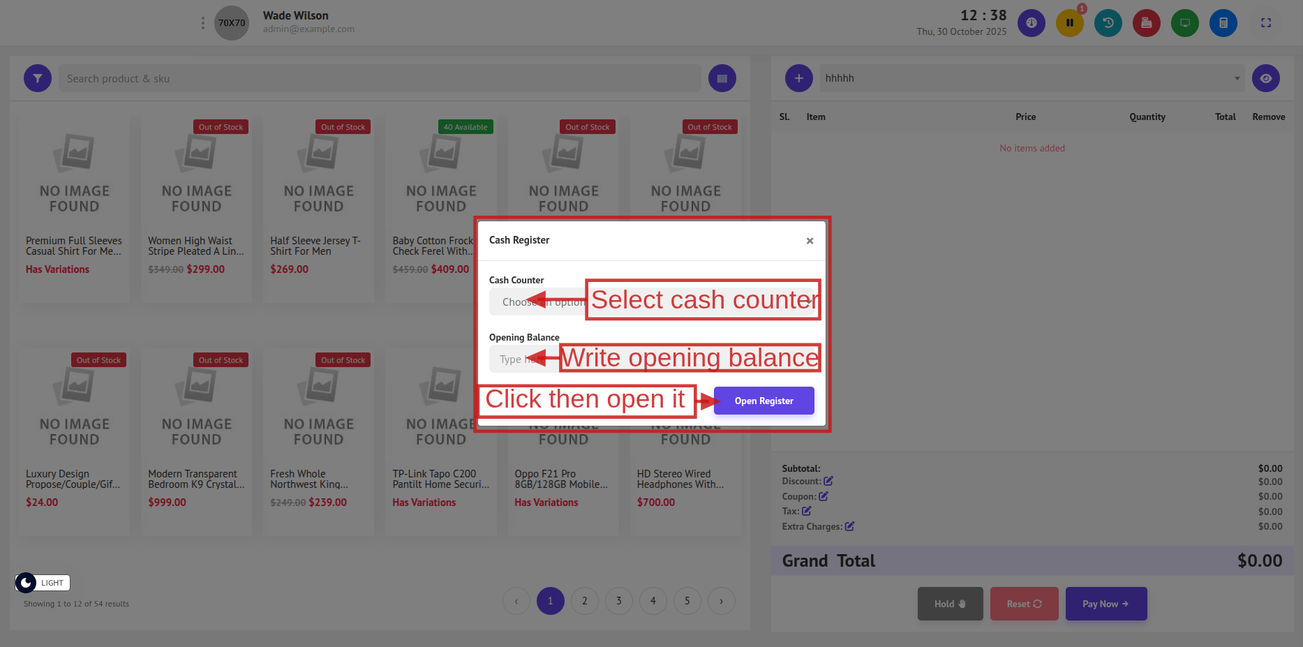 Once the cash counter is selected and the opening balance is provided, click the Open Register button.