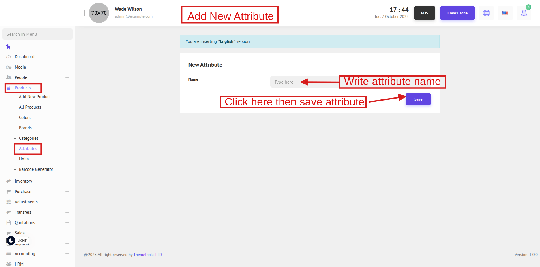 To view the Product Attributes list, go to Products > Attributes. This will display all available product attributes in the system.