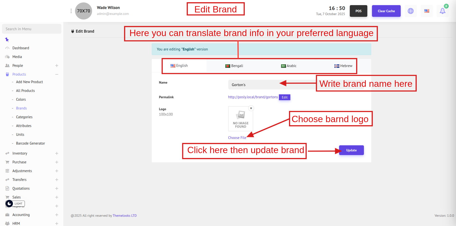 You can view the list of brands and various options on this page. To add a new brand, click the Add New Brand button at the top. You will be redirected to a new page to enter brand details.