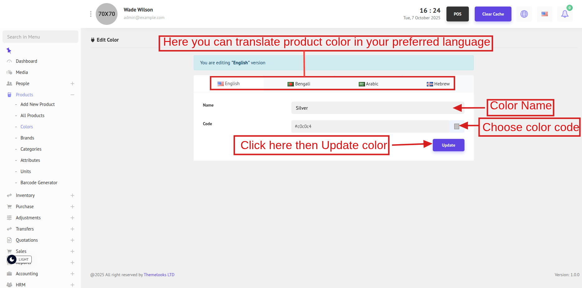 To update a color, click Edit from the Color List page. You will be redirected to the Edit Color page to modify the color details.