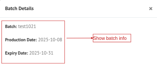 If the product has a Batch, a popup modal will appear. Add the Batch number and click Add. You can also edit the Batch by clicking the Edit icon, or view it by clicking the View icon to open the popup modal showing the Batch details.