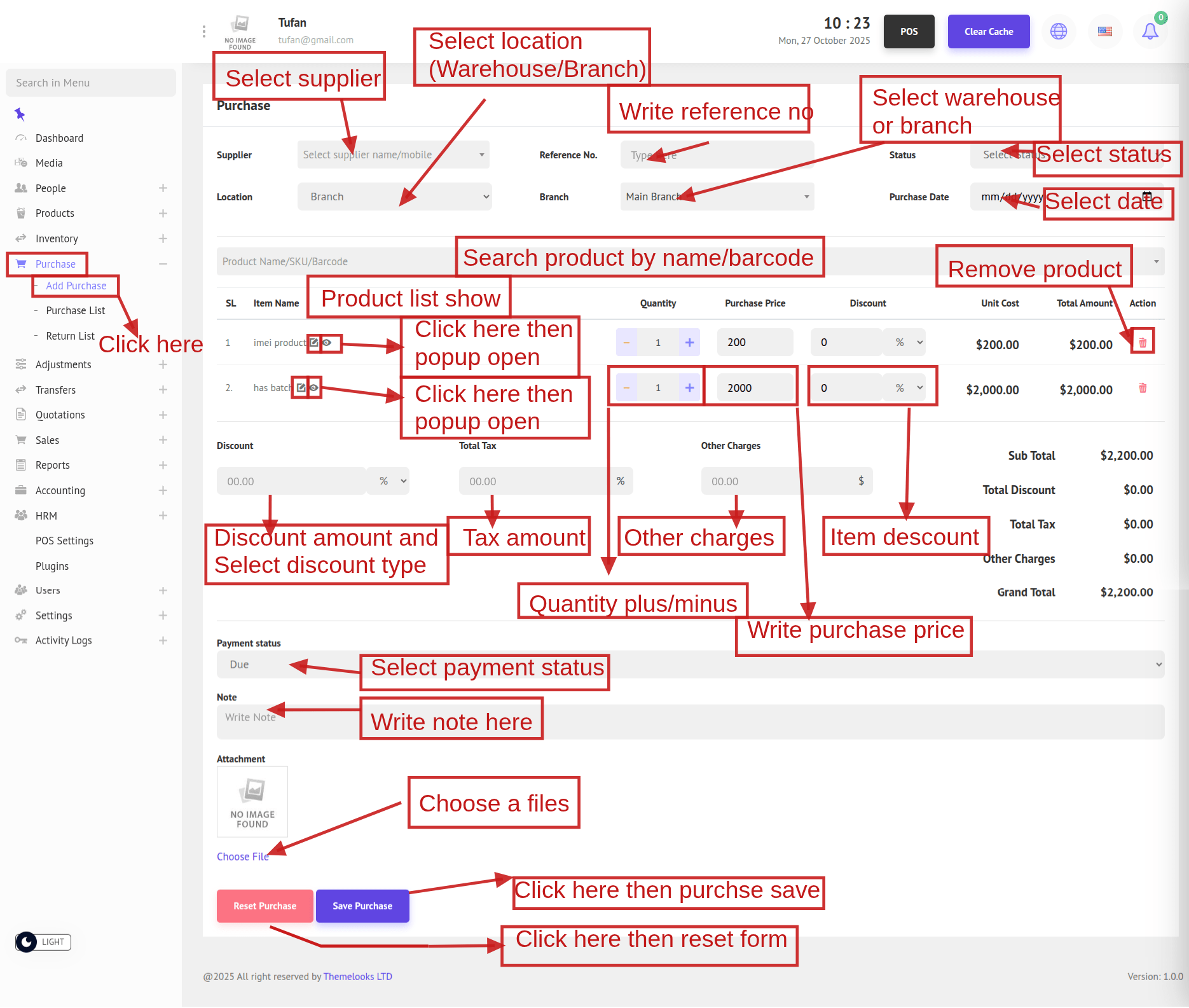1. To add a new purchase, navigate to Purchase -> Add Purchase from the menu bar. This will redirect you to the Add Purchase page where you can create a new purchase record.