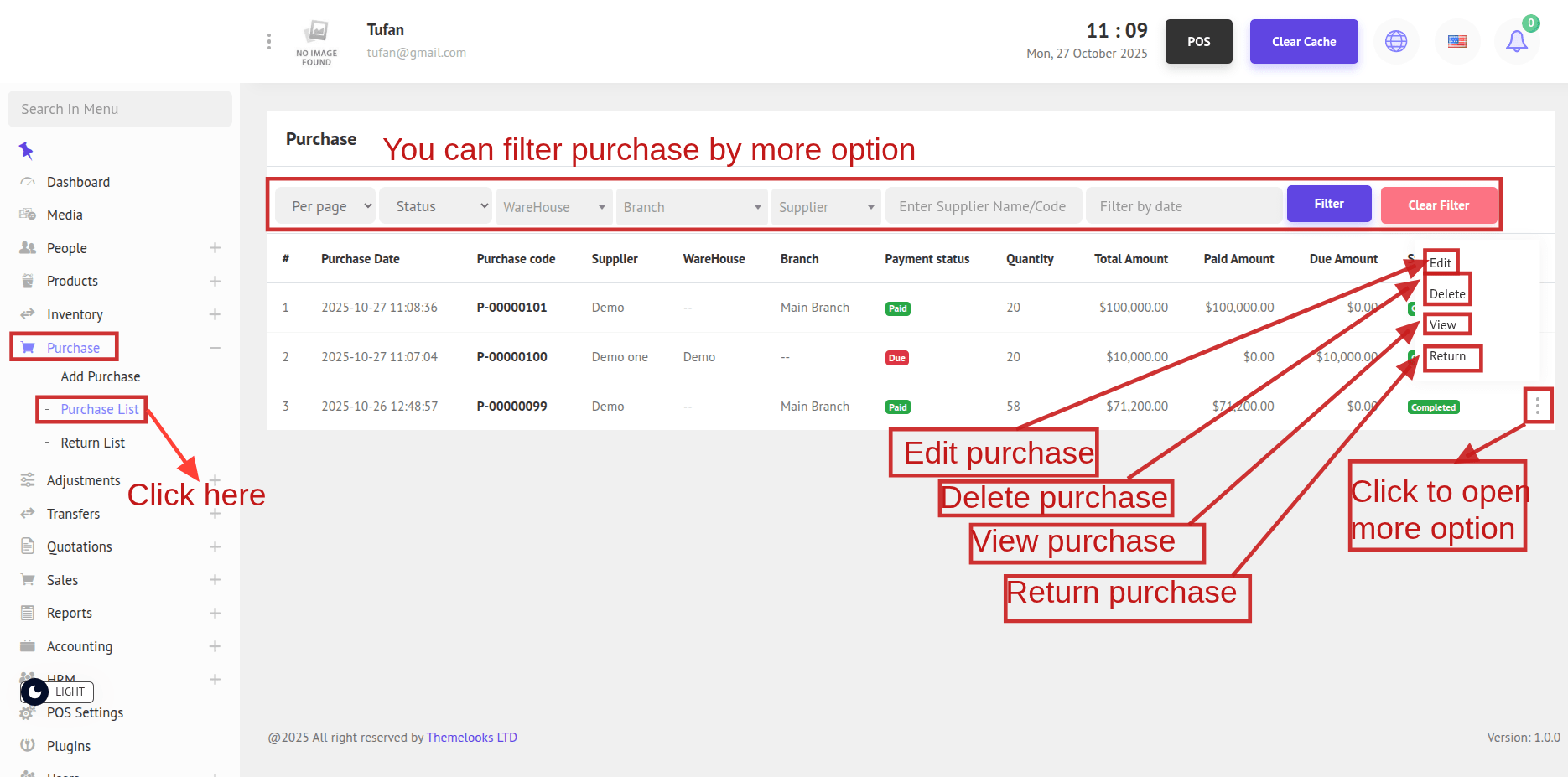 2. To see the Purchase List, go to Purchase -> Purchase List from the menu bar. You will be able to view all purchases on the Purchase List page.