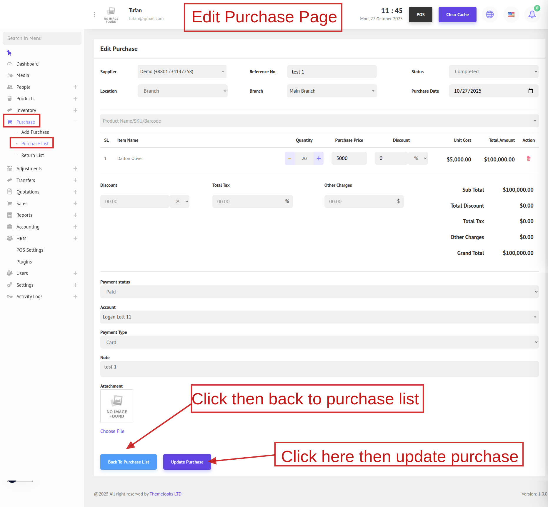 To edit a purchase, click the Edit button. You will be redirected to the Edit Purchase page, where you can make changes to the data and click Update Purchase to save. If no changes are needed, click Back to Purchase List. You can also delete a purchase by clicking the Delete button.