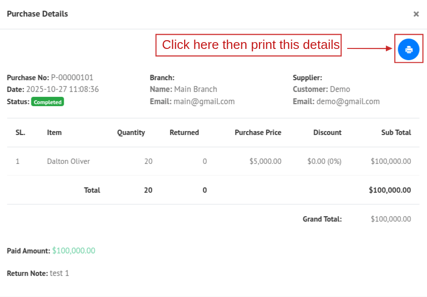 You can also view the details of a purchase by clicking the View button. A popup modal will appear showing the purchase details.