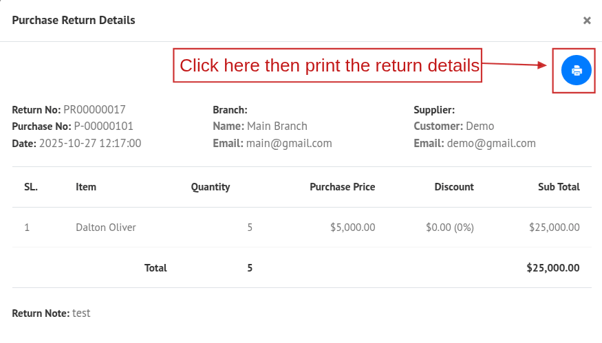 Click the View button to see the return details in a popup modal.