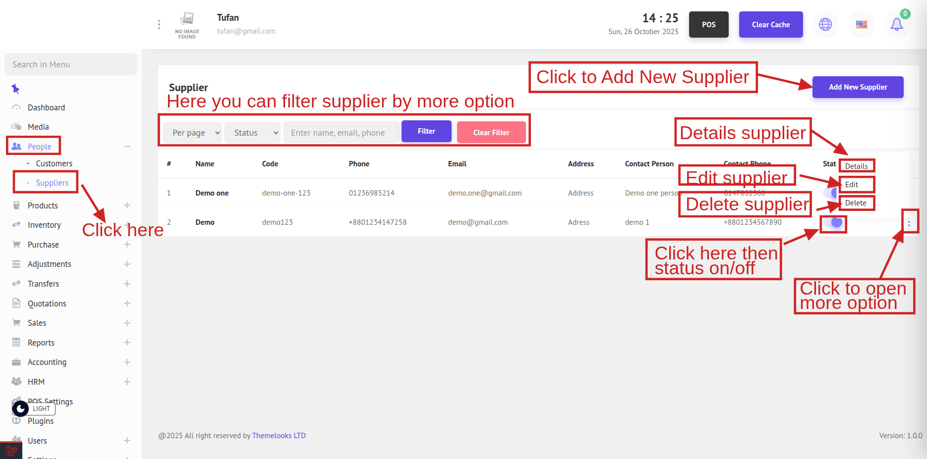 To see the Suppliers List, go to People -> Suppliers from the menu bar. You will be able to view all supplier on the Supplier List page.