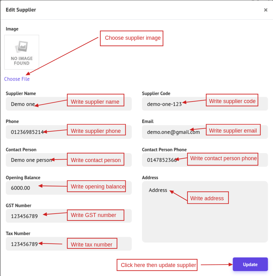 To edit supplier information, click the Edit button. A popup modal will appear where you can update the supplier details. After making the changes, click Save Changes. You can also delete a supplier by clicking Delete.
