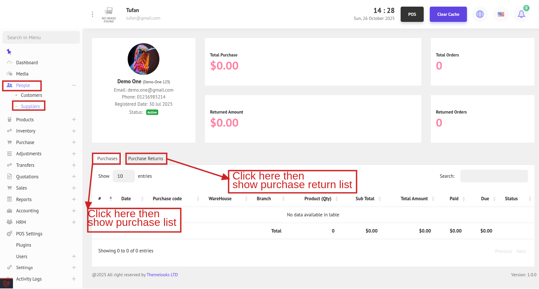 To view supplier details, click the Details button. You will be redirected to the Supplier Details page, where you can see the total number of orders, total purchase amount, and total returns made by the supplier.