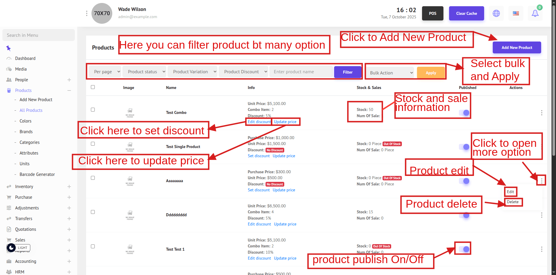 To view the product list, go to Products > All Products. You will be redirected to the Product List page. The image below provides a brief explanation of the features and options available on this page.