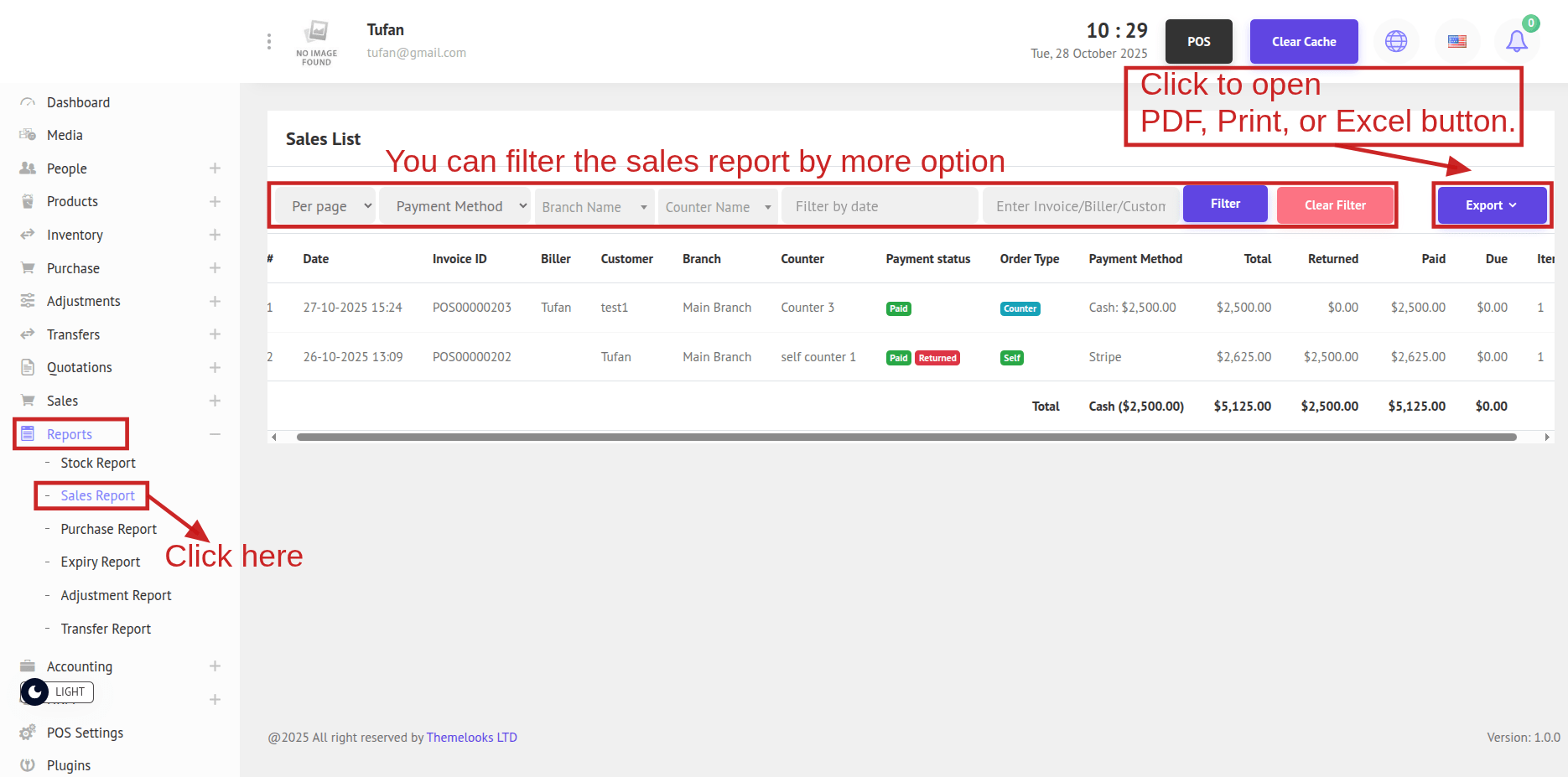 2. To view the Sales Report, go to Reports -> Sales Report from the menu bar. You’ll be redirected to the Sales Report page, where all sales data is displayed. Click the Export button to open a drop-down with Print, PDF, and Excel options, and select your preferred format to download the report.