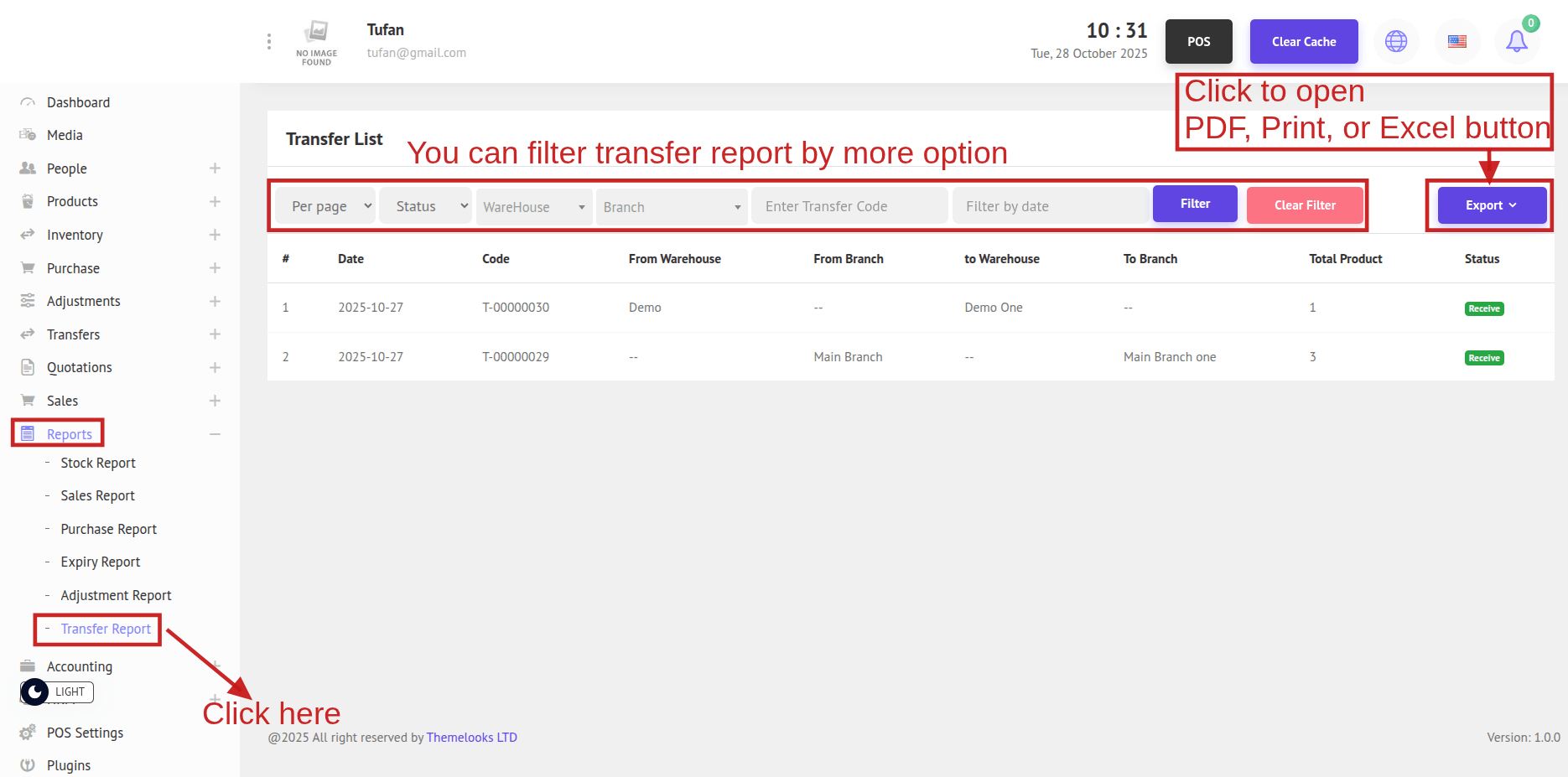 6. Go to Reports > Transfer Report to view all transfer data. Use Export to choose Print, PDF, or Excel and download the report.